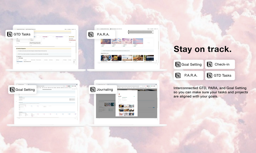 With interconnected GTD, PARA, and Goal Setting templates, this ALL-IN life Management SYSTEM is meant to help you organize and align all the different areas of your life.